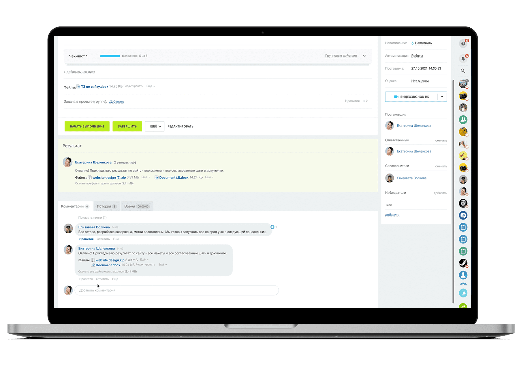 Больше не придется долго искать итог работы – всего один клик на задачу, и вы сразу видите, как именно сотрудник выполнил поручение.